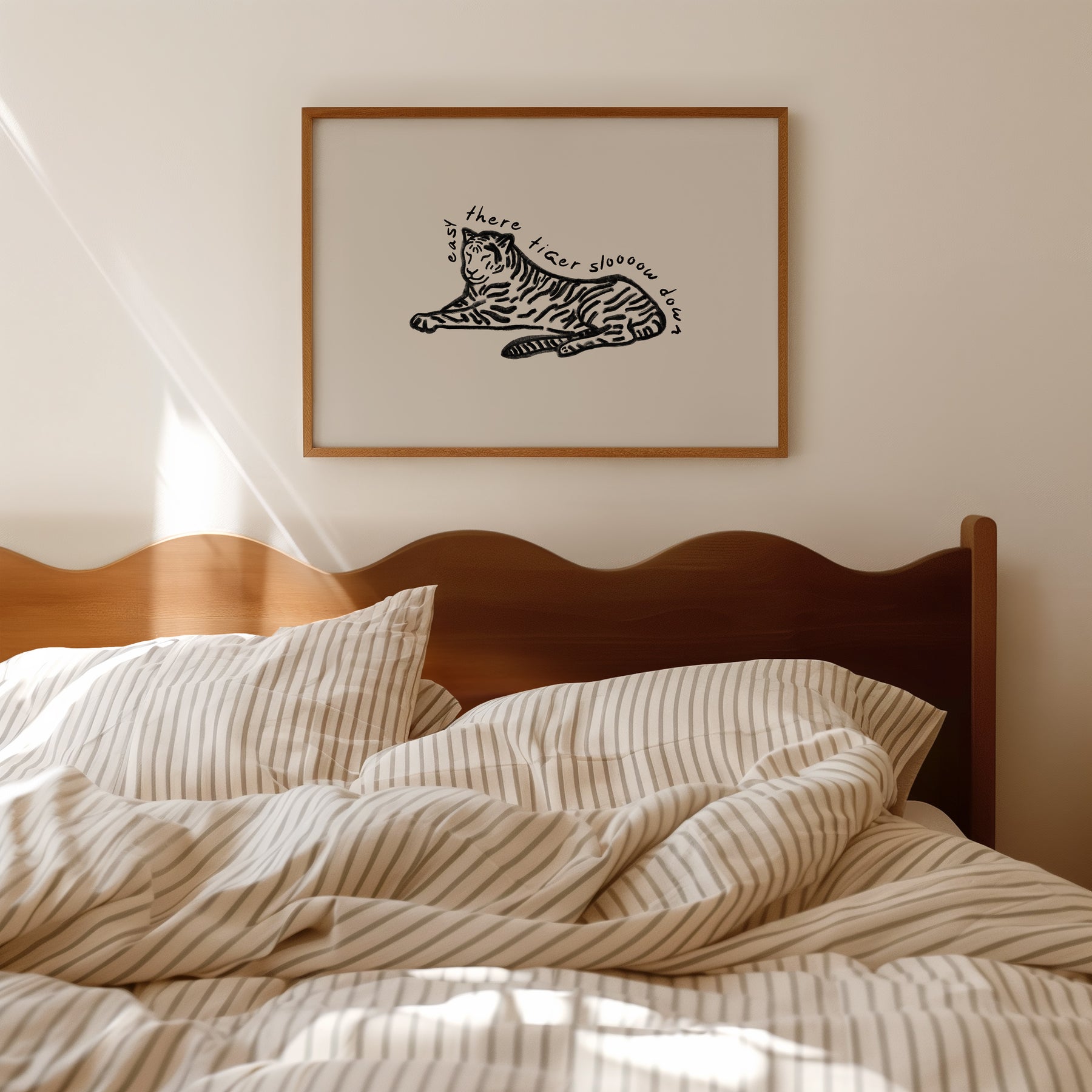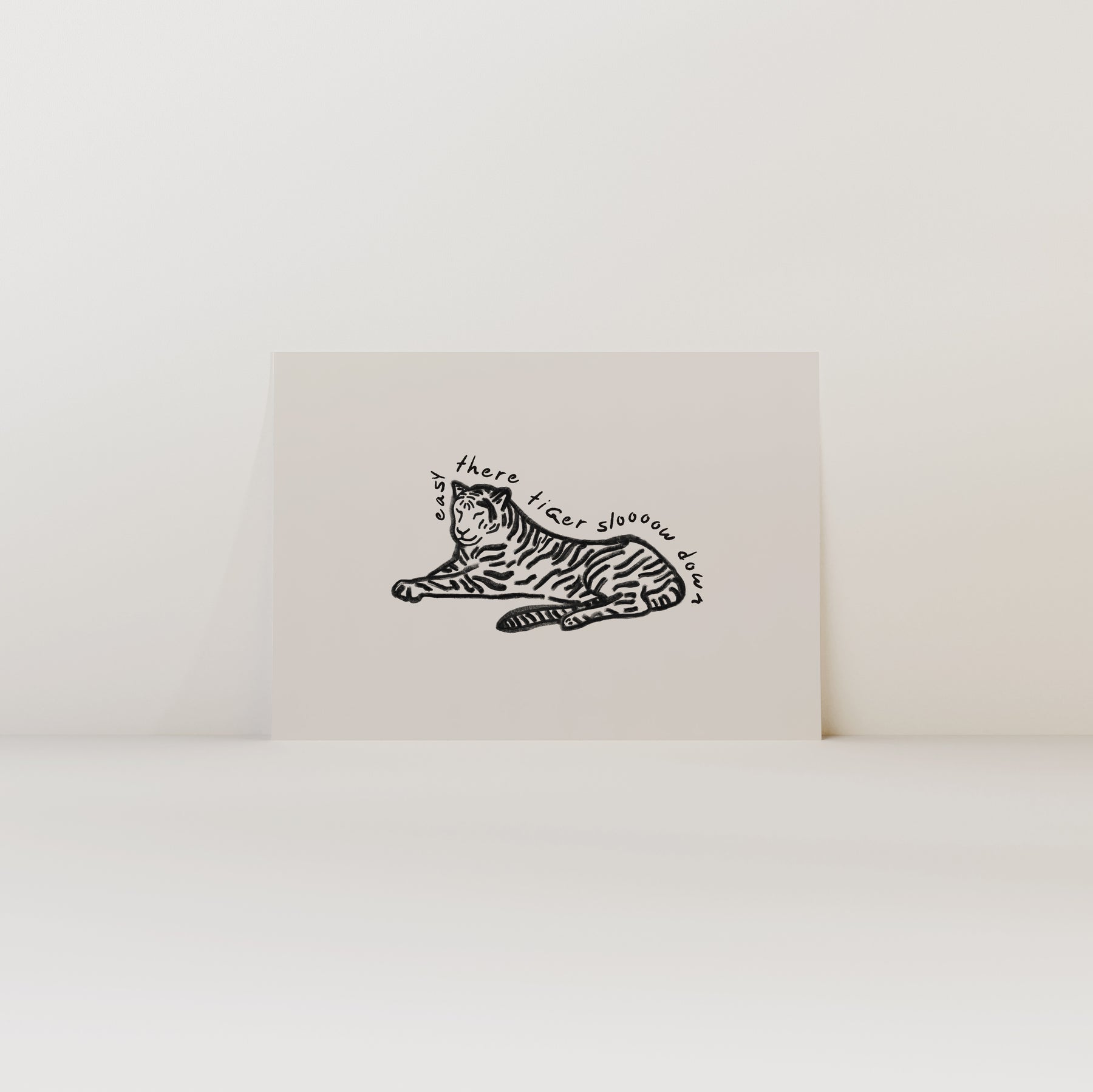 Sloooow down there, tiger! The Easy Tiger print features a tiger illustration with the words "easy there tiger slooow down" curving around it. Perfect for any space that needs a touch of humor.