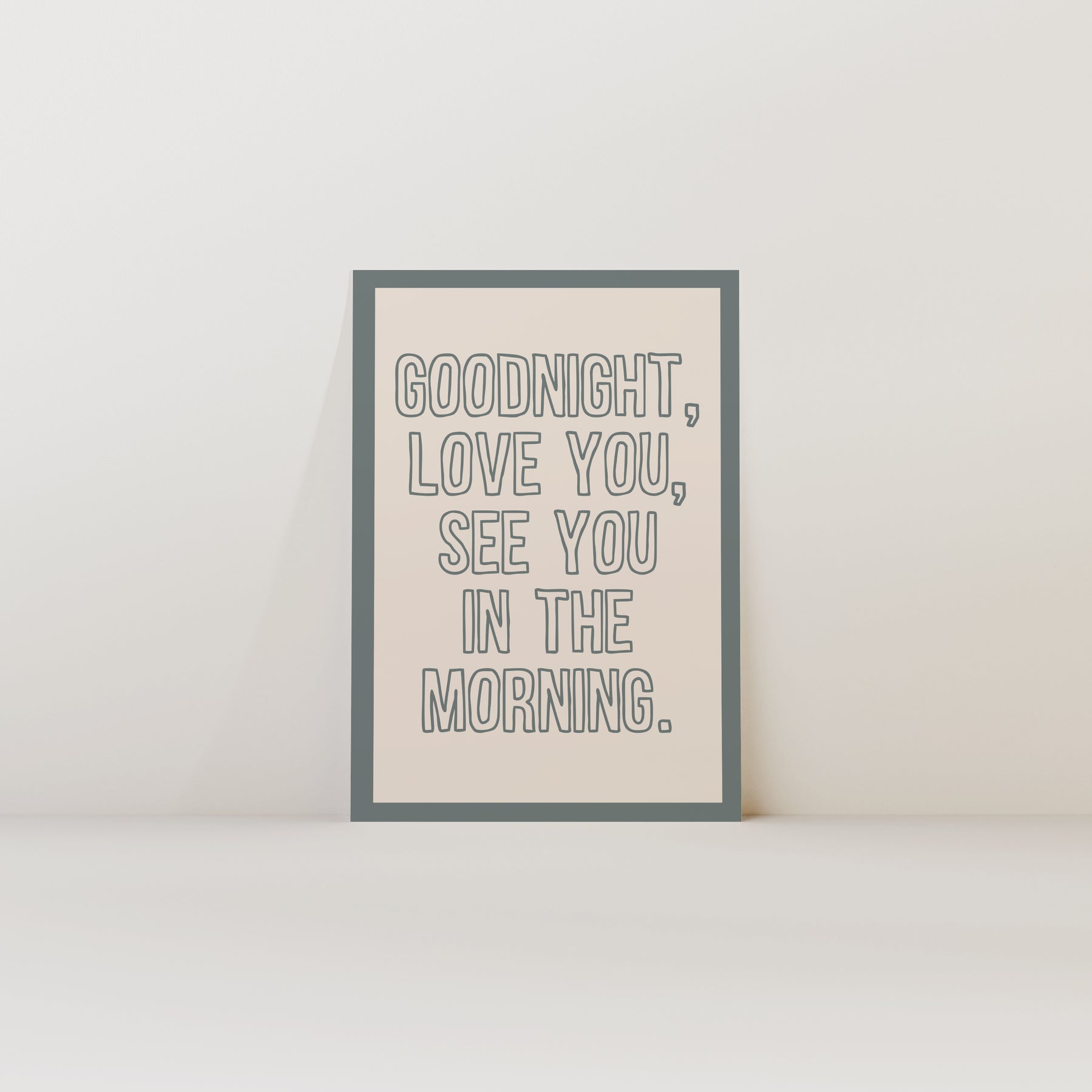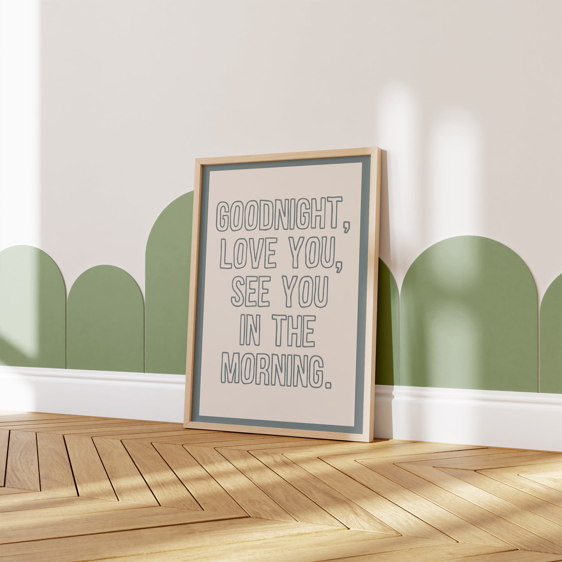 The KIKIANDNIM kids collection is rooted in uplifting our littles, celebrating the silly, and of course, bringing joy to parents and kids alike. The "Goodnight Love You See You in the Morning" print is perfect for a child's room or baby nursery!