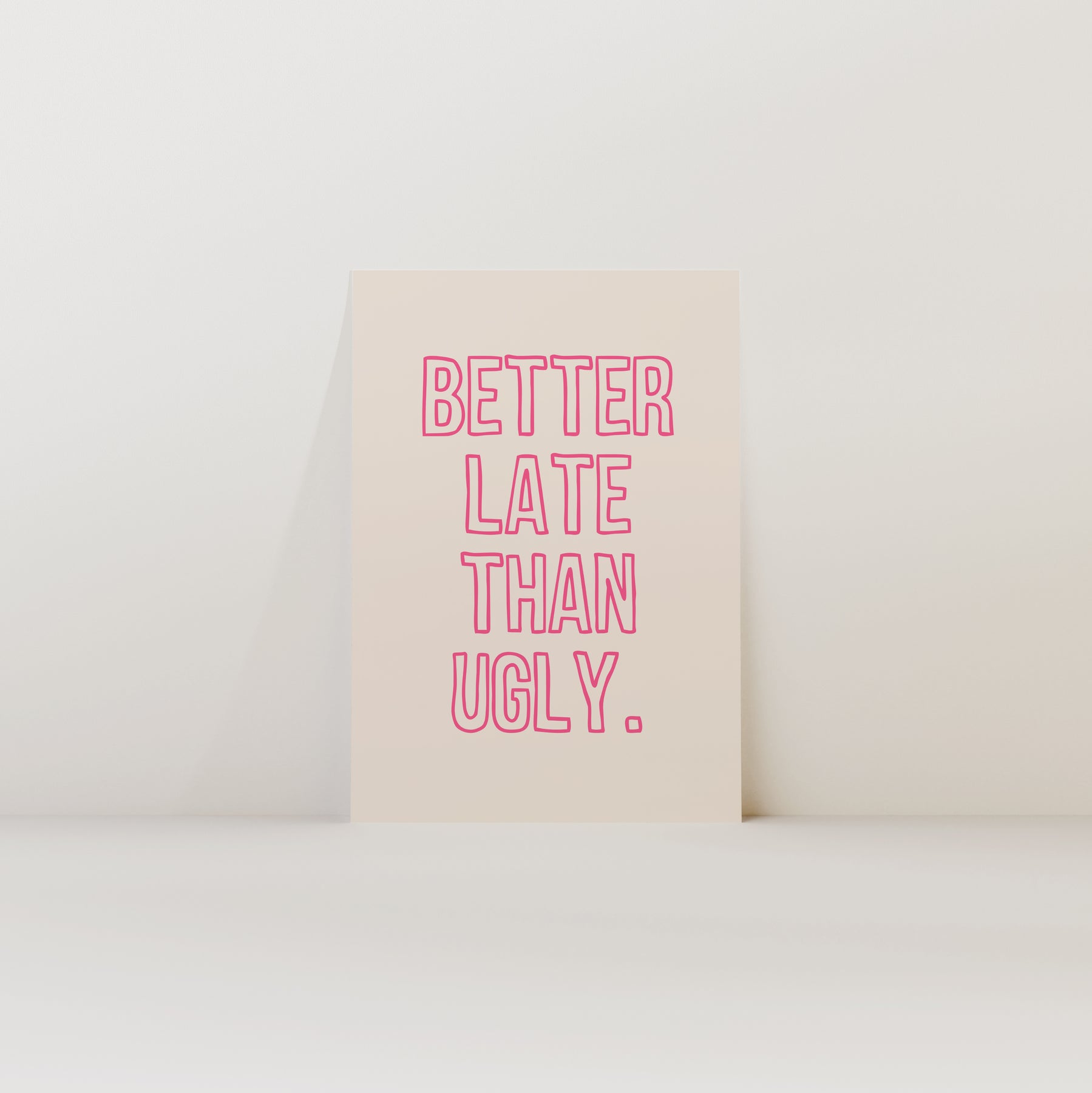 Quick reminder, you can't rush perfection. Better Late Than Ugly has become a favorite KIKIANDNIM print. Hang it up in your bathroom as a friendly reminder to take your time babe!